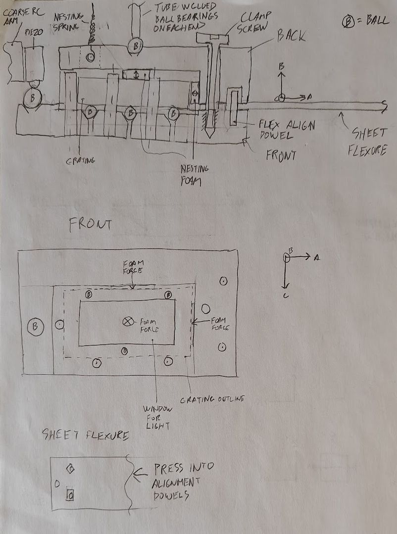 It locates the grating on an exactly constrained three-ball and three-pin mount, with foam pieces on the back and side to nest the grating into the constraints. The grating is then held by a two-part 3D printed mounting mechanism to keep everything in place.