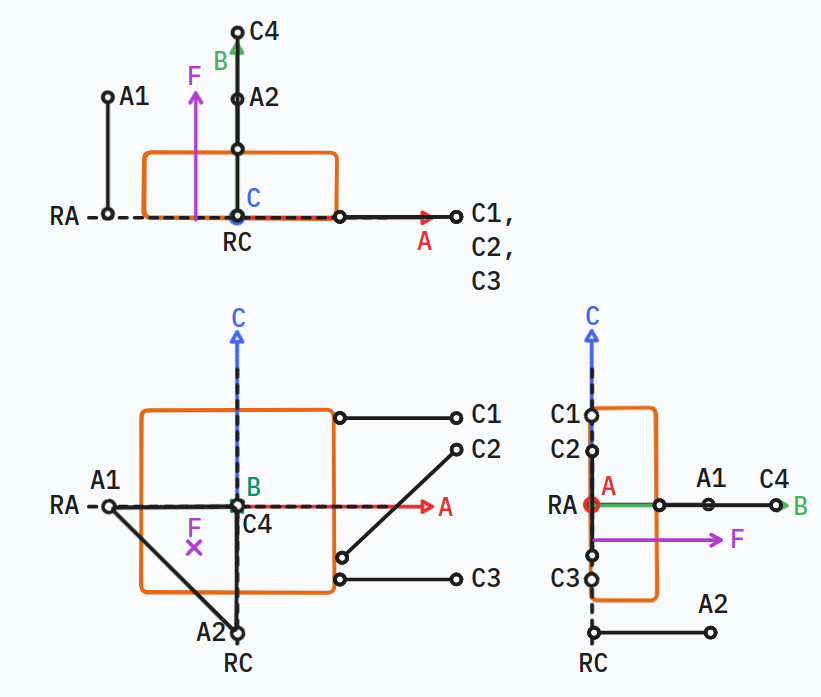 If C4, A1, and A2 are contact constraints like the tip of a screw or piezo actuator, we’ll need a nesting force to keep the grating in contact with those constraints. We can place a single nesting force in the triangle between A1, A2, and C4, and ideally roughly equidistant to the three constraints to keep them in contact.