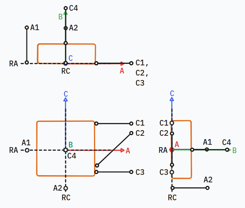 One way to accomplish this is to lay 3 constraints in the AC plane to form a sheet flexure, then place the fourth constraint at the intersection of RA and RC.