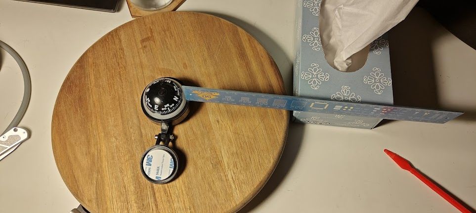I used a ruler as a pointer and sticky-tacked it to a tissue box I had nearby, then put the compass on a lazy susan I had kicking around.